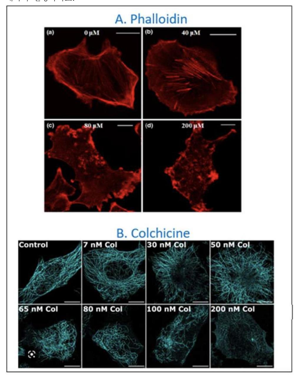 기존 해설은 A = Cytochalasin D, B = Nocodazole로 잘못 기재하였다. 그림을 직접 확인한 결과 A = Phalloidin, B = Colchicine이다.