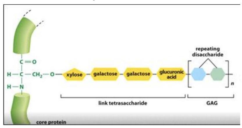 Core protein — Ser — (O-xylose) — GalNAc/GlcNAc 반복 ... → GAG chain