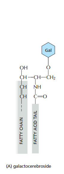 위에서 D. 한쪽 chain이 fatty chain인 sphingosine을 전구체로 삼음 sphingosine은 이후 Glycolipid의 전구체이기도 함. sphingolipid는 cholesterol과 결합력이 좋아 lipid raft 형성에 관여함.