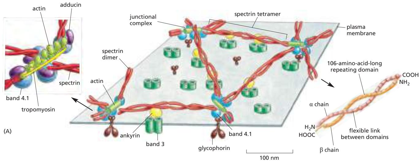 - Red blood cell membrane의 cytosolic side에서 cytoskeleton