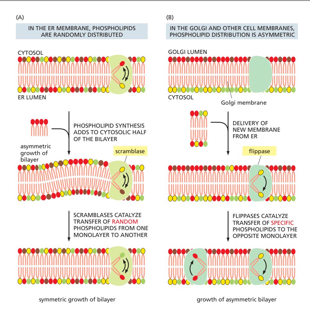 Scramblase가 ER membrane에서 phospholipid를 비선택적으로 equilibrate하여 대칭적인 분포를 만드는 것과 달리, 다른 organelle에서는 의도적인 비대칭성이 필요하다.