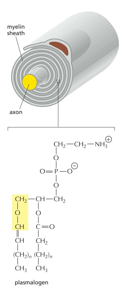 Fig 12-44. Plasmalogen의 구조. Ethanolamine head group과 장쇄 지방산 외에, ether 결합(노란색 강조)을 통해 연결된 특이한 fatty alcohol을 포함한다.