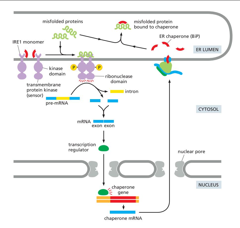 UPR은 세 가지 독립적이면서 협력하는 경로로 구성된다. 각 경로는 ER membrane에 있는 transmembrane sensor protein에서 시작하여, 최종적으로 핵에서 전사인자를 활성화한다.