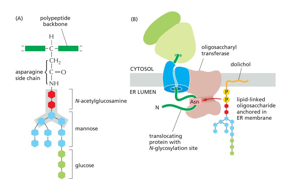 N-linked glycosylation은 preformed precursor Oligosaccharides가 단백질의 asparagine 잔기에 en bloc (한 덩어리로) 부착되는 과정이다. ER에서 일어나는 가장 흔한 glycosylation 형태이다.