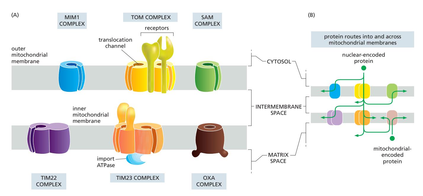 미토콘드리아 막에는 약 1500여 종의 precursor protein을 각 subcompartment로 보내는 여러 translocator 복합체가 존재한다.
