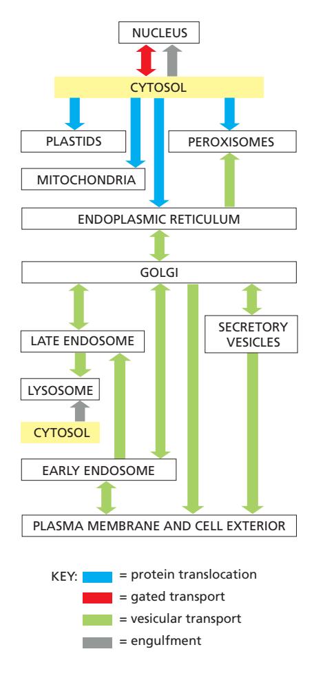 한 구획에서 다른 구획으로 단백질을 이동시키는 네 가지 근본적으로 다른 방식이 있다: