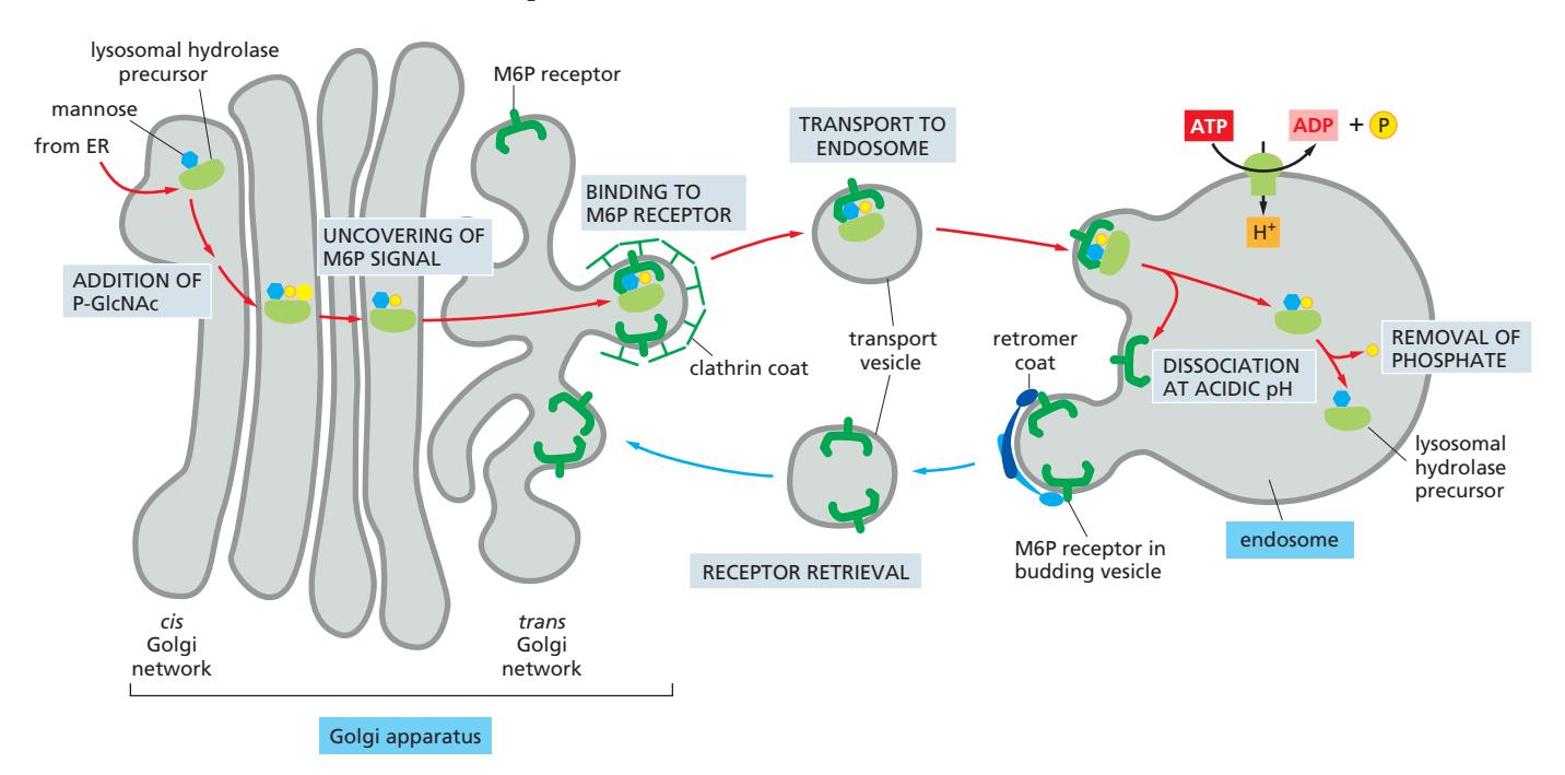 - M6P receptor: Clathrin-coated vesicle (forward) 및 retromer-coated vesicle (retrieval)
