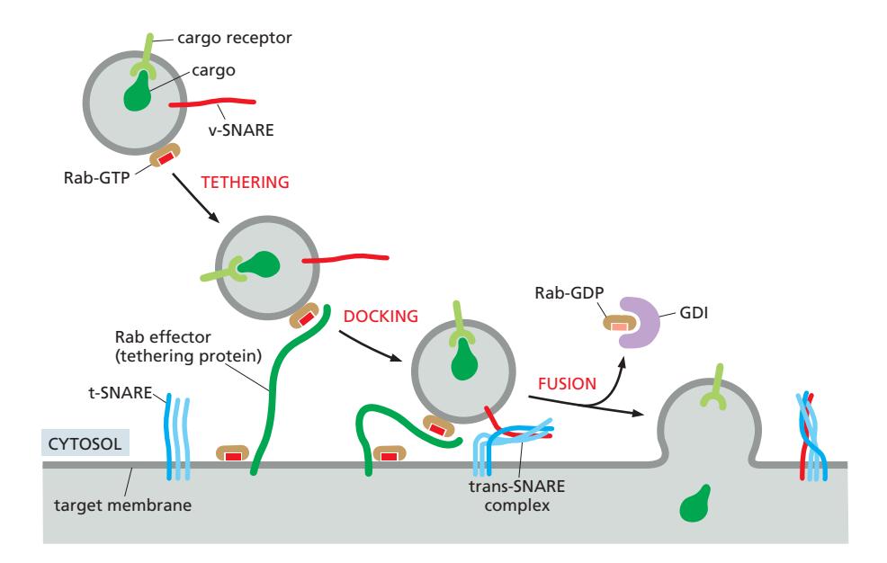 - Vesicle의 Rab-GTP와 target membrane의 Rab effector 상호작용. Rab effector는 target membrane의 Rab-GTP와도 상호작용. 여기서 두 Rab는 같은 종류여야함.