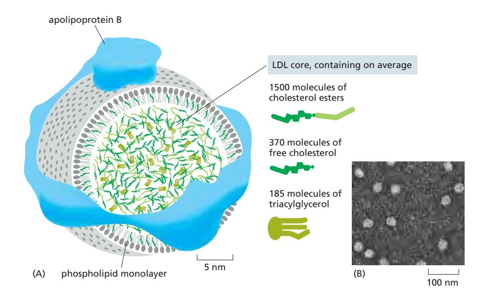 대부분의 cholesterol은 혈액에서 cholesterol ester로서 **low-density lipoprotein (LDL)**의 형태로 운반된다: