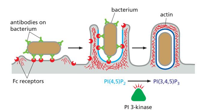 Pseudopod extension과 phagosome formation은 actin polymerization과 reorganization에 의해 추진되며, 이는 forming phagosome 막의 특정 phosphoinositide 축적에 반응한다: