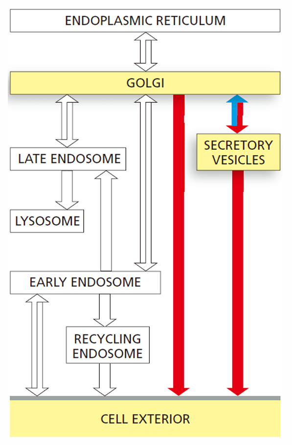 Figure 13-3: Secretory pathway와 endocytic pathway의 개략도. Red arrow는 secretory pathway, green arrow는 endocytic pathway, blue arrow는 retrieval pathway를 나타낸다.
