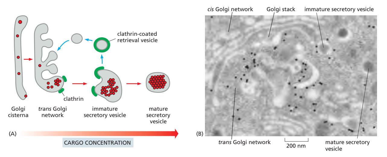 Figure 13-42: Secretory vesicle의 형성. (A) TGN에서 immature secretory vesicle이 형성되고, clathrin-coated vesicle을 통한 retrieval로 성숙한다. (B) Pancreatic β cell에서 proinsulin을 포함한 secretory vesicle의 성숙 과정.