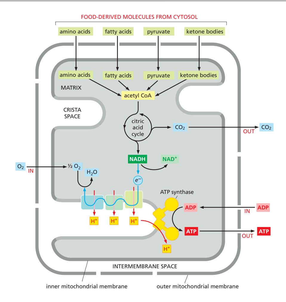 Figure 14-10: 미토콘드리아에서의 에너지 변환 대사 요약.