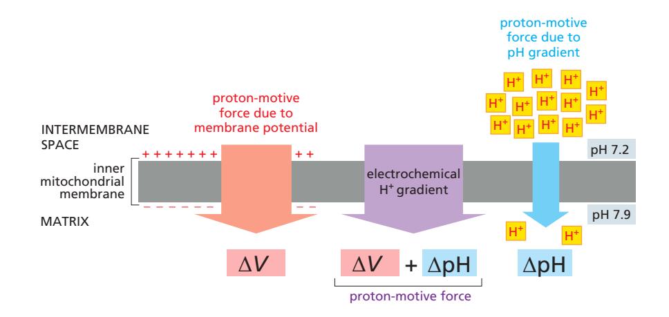 Figure 14-14: 미토콘드리아 inner membrane의 electrochemical proton gradient.