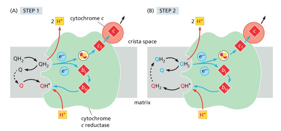Figure 14-23: Cytochrome c reductase의 두 단계 Q cycle 메커니즘.