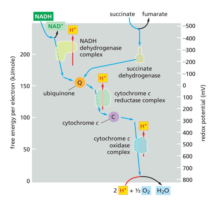 • NADH (E’₀ = −320 mV) → O₂ (E’₀ = +820 mV)