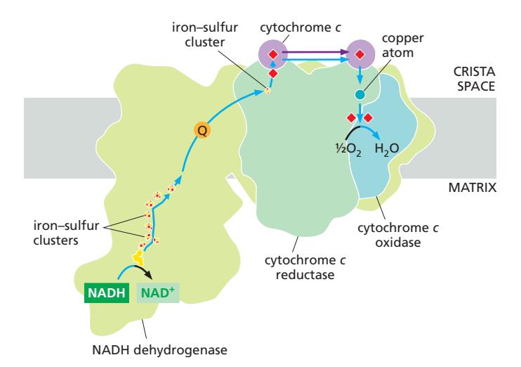 Figure 14-18: 미토콘드리아 전자전달계의 세 proton pump와 전자 경로.