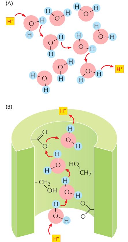 Figure 14-28: 물과 단백질에서의 proton 이동 비교. Proton wire를 통한 이동은 40배 빠름.