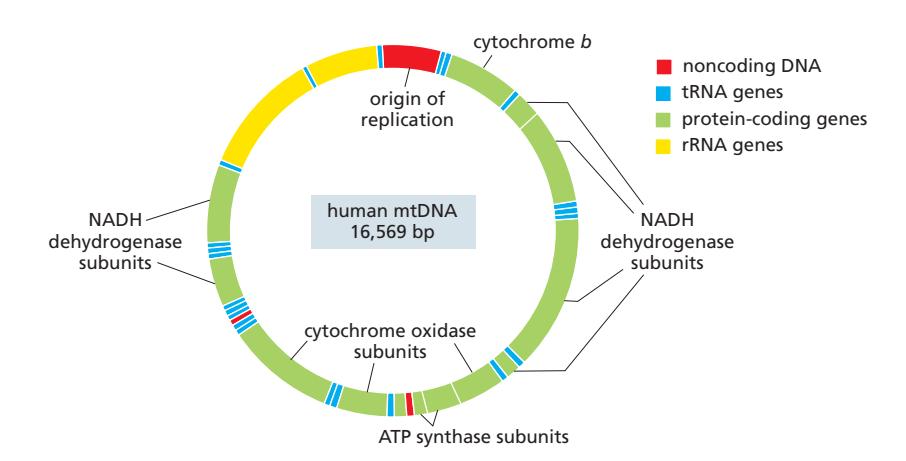Figure 14-59: 인간 미토콘드리아 genome (~16,600 bp). rRNA, tRNA, 13개 단백질 coding 유전자.