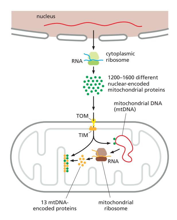 나머지 ~1,200–1,600종의 미토콘드리아 단백질은 핵 genome encoding → 세포질에서 합성 → 미토콘드리아로 import