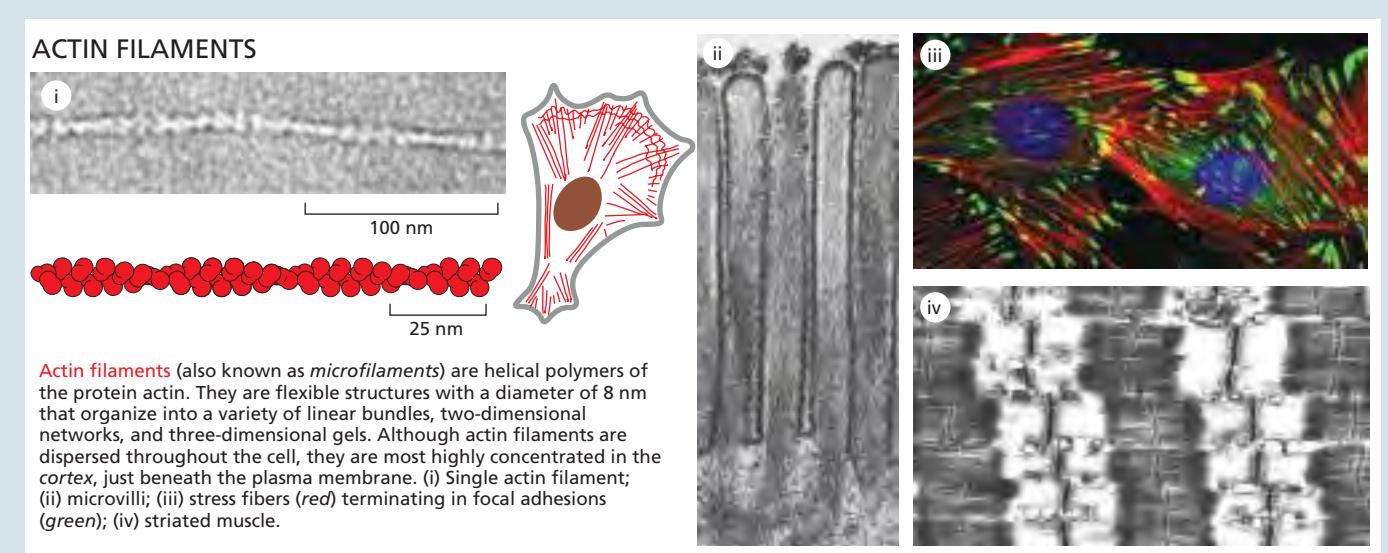 (i) 단일 actin filament; (ii) microvilli; (iii) focal adhesion(green)으로 끝나는 stress fibers(red); (iv) striated muscle.