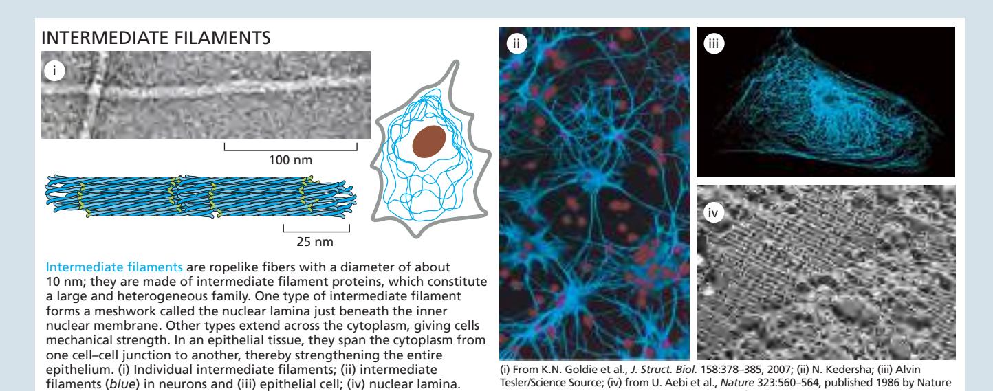 (i) 개별 intermediate filament; (ii) 뉴런(파랑)과 (iii) 상피세포의 intermediate filament; (iv) nuclear lamina.