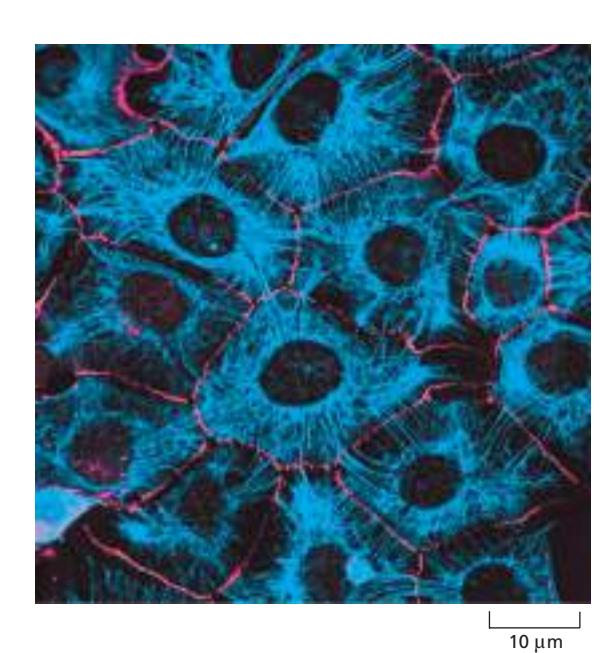 배양된 상피세포 시트에서 keratin 필라멘트 네트워크(파랑). 각 세포의 필라멘트는 desmosome을 통해 이웃 세포와 간접적으로 연결된다.