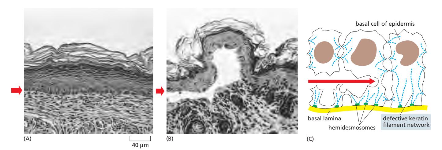 (A) 정상 피부 단면. (B) 돌연변이 keratin을 발현하는 형질전환 마우스의 피부 — 표피 기저층 세포가 파열되어 수포 형성(빨간 화살표). (C) 기저층 세포 모식도 — 세포는 핵과 hemidesmosome 사이에서 파열된다. 결함 있는 단백질이 정상 keratin과 공조립되어 필라멘트 네트워크를 전반적으로 교란시키기 때문이다.