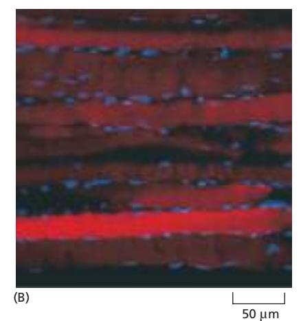 - B는 형광 현미경 사진. myofibril은 적색, 핵은 청색으로 염색되어있다.
