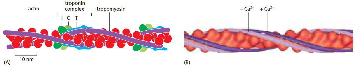 Fig 16–31. Troponin에 의한 골격근 수축 조절. (A) Tropomyosin과 troponin의 배치. (B) Ca²⁺ 존재(짙은 보라)와 부재(옅은 보라) 시 tropomyosin 위치 변화.