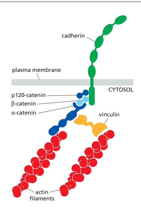 Figure 19-11. Cadherin–catenin–actin 연결. p120-catenin과 β-catenin이 cadherin tail에 직접 결합하고, α-catenin이 β-catenin에 결합하여 actin filament와의 동적 연결을 제공한다. Vinculin은 α-catenin과 결합해 actin 연결을 강화한다.
