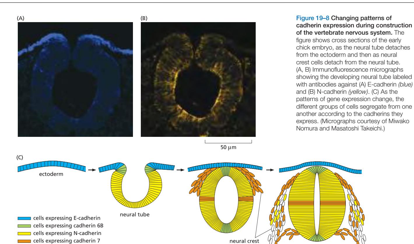 Figure 19-8. 신경관 형성 시 cadherin 발현 변화. Neural tube 세포는 E-cadherin을 잃고 N-cadherin을 획득하는 반면, 위를 덮는 ectoderm 세포는 E-cadherin을 유지한다. Neural crest 세포가 이주할 때는 cadherin이 거의 사라지고 cadherin 7이 나타나 느슨한 그룹으로 이동을 가능하게 하며, 신경절 형성 시 다시 N-cadherin이 발현된다.
