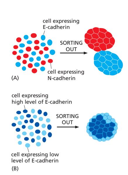 Figure 19-9. (A) N-cadherin 발현 세포와 E-cadherin 발현 세포가 서로 분리되어 응집한다. (B) 같은 cadherin이라도 발현 수준이 높은 세포가 내부에, 낮은 세포가 외부에 분포한다.