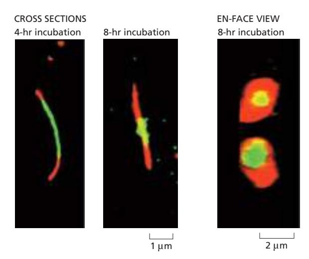 Figure 19-26. Tetracysteine tag이 붙은 connexin 실험. 처음에 녹색 dye로 표지된 연결단백질(초록)과 나중에 붉은 dye로 표지된 새로운 connexin(빨강)이 구분된다. 시간이 지날수록 plaque 중앙의 오래된 connexin이 줄고 주변부의 새 connexin이 늘어나는 것을 보여준다. Connexin의 half-life는 수 시간에 불과하다.
