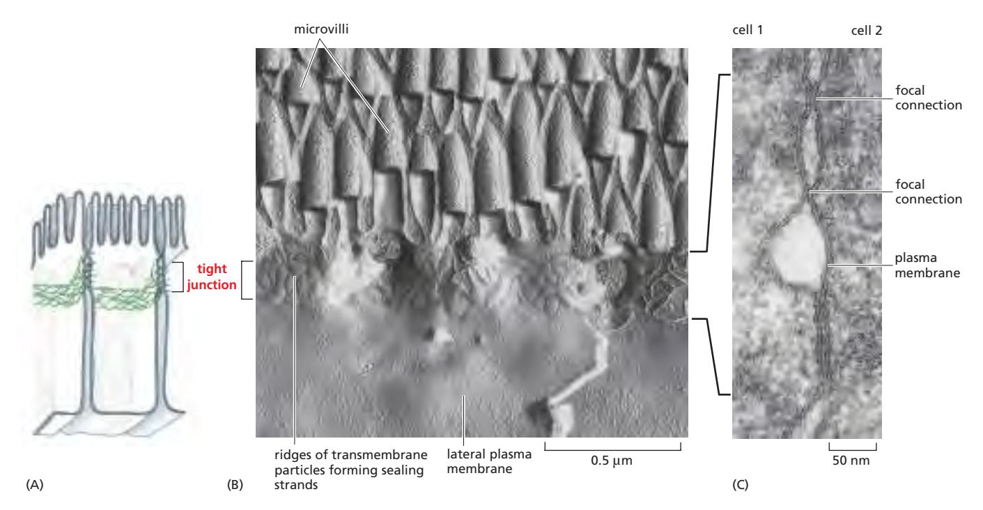 Figure 19-20. 소장 상피의 tight junction. (A) 도식, (B) freeze-fracture 전자현미경 사진: tight junction이 각 세포를 둘러싸는 sealing strand의 분기 네트워크로 보인다. (C) 단면 전자현미경 사진: sealing strand 단면에 해당하는 두 인접 막의 focal 접촉이 보인다.