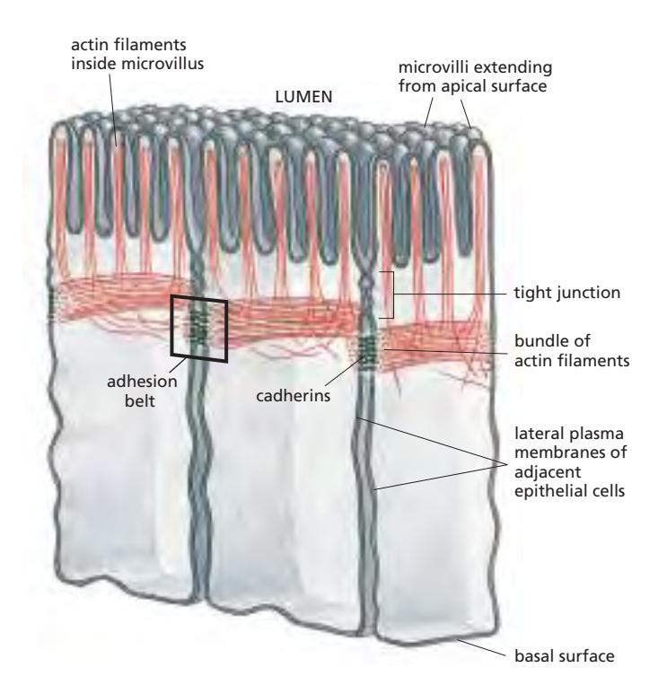 Figure 19-13. 소장 상피세포의 adherens junction. Adhesion belt 형태로 각 세포를 둘러싸며, cadherin에 고정된 수축성 actin filament bundle이 인접 세포와 연결된다.