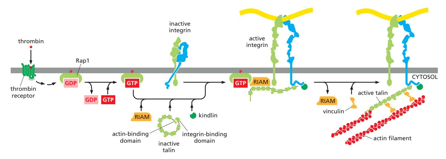 Figure 19-59. Platelet에서 thrombin 신호가 Rap1 GTPase를 활성화하고, 이것이 RIAM을 통해 talin을 plasma membrane으로 모집한다. Talin은 평소 접힌 비활성 상태로 존재하다가, membrane에 모집되면 펼쳐져서 integrin β-chain과 상호작용하여 integrin을 활성화시킨다.