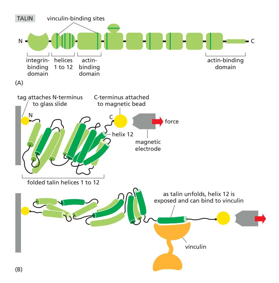 이 메커니즘을 통해 장력이 증가하면 junction이 자동으로 강화되는 positive feedback이 작동한다. Talin은 12개의 α-helix로 이루어진 bundle 구조에 5개의 vinculin 결합 부위를 포함하며, 이들이 장력에 의해 순차적으로 노출된다.