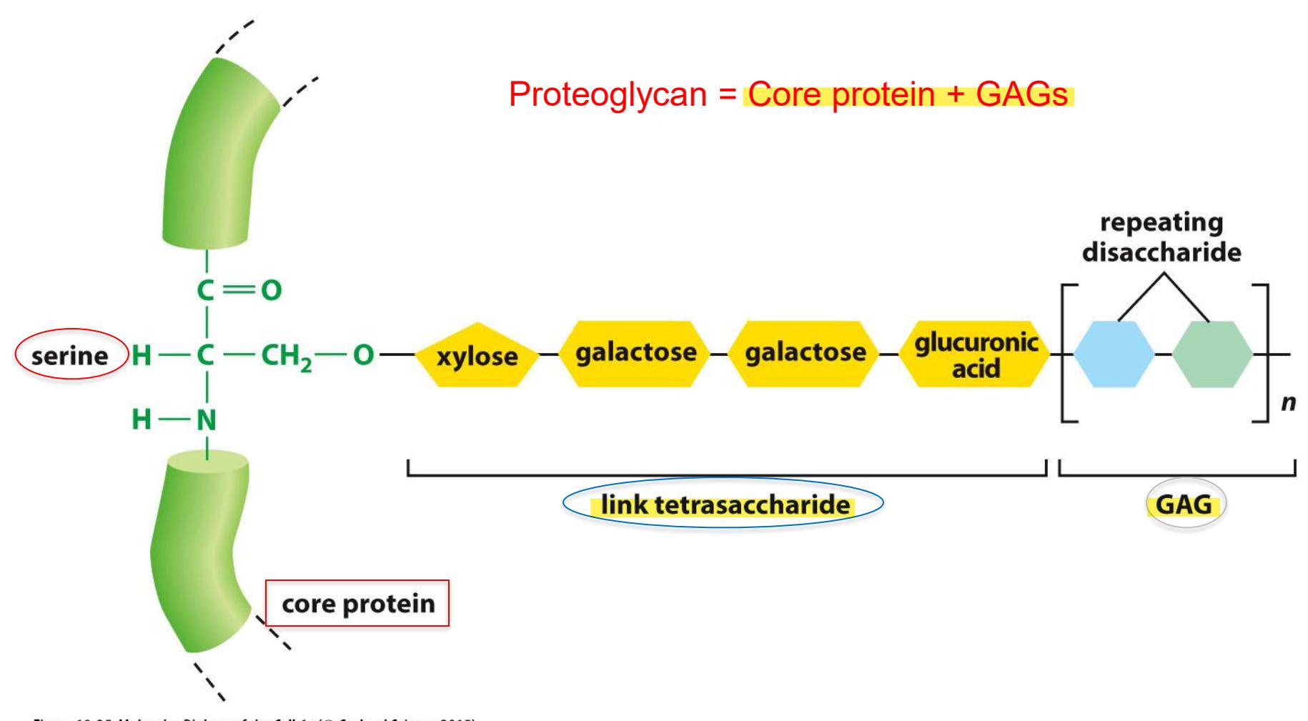 Hyaluronan을 제외한 모든 GAG는 단백질에 공유결합하여 proteoglycan을 형성한다.