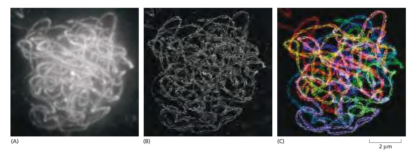 표본: Maize cell의 pachytene 단계 meiotic chromosomes의 three-dimensional projections 염색: Synaptonemal complexes의 paired lateral elements를 보여줌