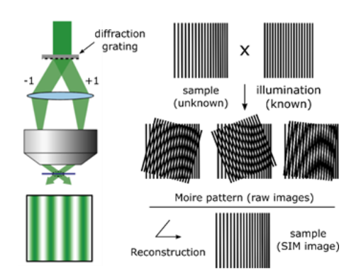 SIM은 grated 또는 structured pattern의 빛으로 sample을 조명하여 회절 한계를 극복한다. Microscope의 물리적 설정과 작동은 상당히 복잡하지만, 일반적인 원리는 moiré pattern(모아레 패턴) 생성과 유사하게 생각할 수 있다.