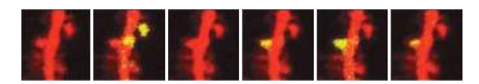 • Dendritic spines(빨간색)의 active synapses(노란색)를 보여줌