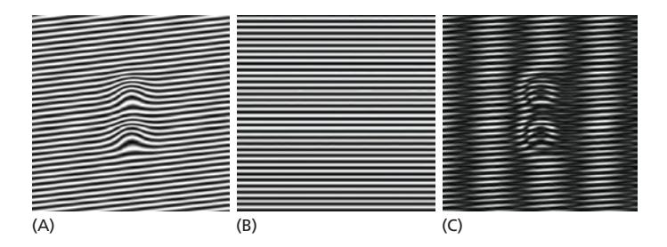 (A) 미지의 구조로부터의 pattern: 원래 구조의 pattern을 보여줌 (B) 정의된 grid pattern: 알려진 grid pattern (C) Moiré pattern: 이 둘을 결합하면 resulting moiré pattern이 A(원래 pattern)에서 쉽게 보이는 것보다 더 많은 정보를 포함함