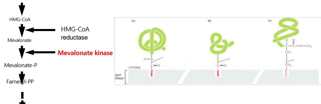 16> HIDS라는 유전병은 Sterol 합성 기전에서 필수적인 Mevalonate Kinase의 기능이 돌연변이로 상실되어 나타나는 유전 병이다. 아래 그림과 연관시켜 질병의 원인을 유추해보자. (E 3점)