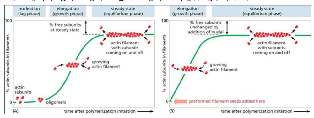 1. 다음은 actin filament elongation 을 테스트하는 실험으로 최소한 투입해야하는 물질을 쓰고 배양용기 안에서 일어난 현상을 그림을 보면서 설명하시오.