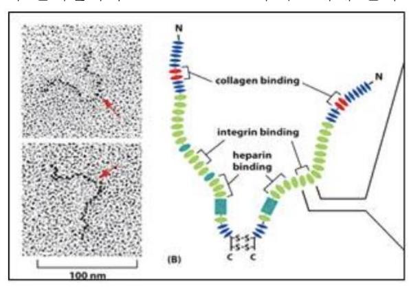 1. Extracelliular matrix 를 구성하는 성분 단백질 중의 하나인 다음 그림의 단백질 이름을 쓰고, 이 단백질에서 cell adhesion 에 주요하게 관여하는 아미노산 3 개를 쓰시오