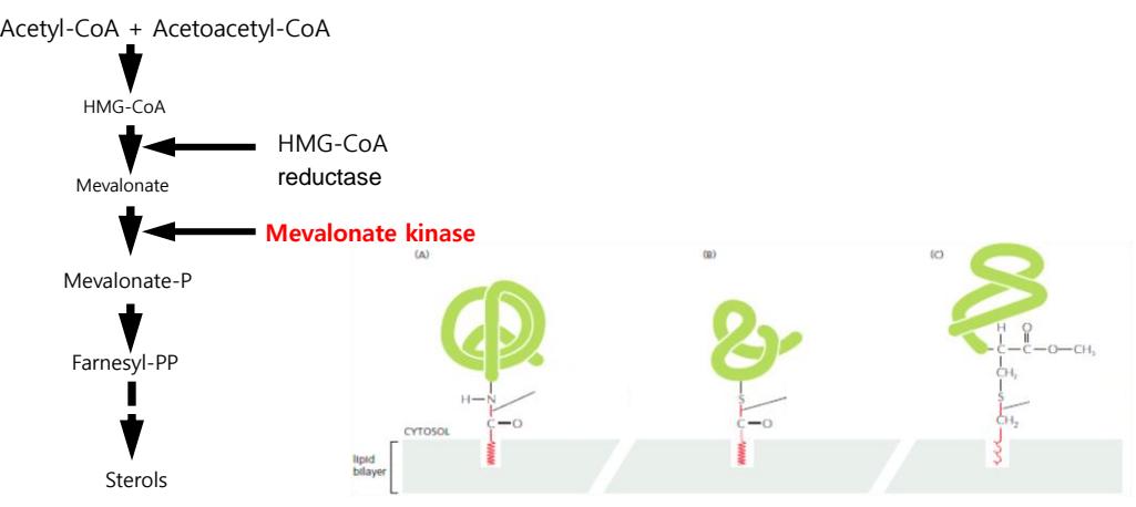 16> HIDS라는 유전병은 Sterol 합성 기전에서 필수적인 Mevalonate Kinase의 기능이 돌연변이로 상실되어 나타나는 유전 병이다. 아래 그림과 연관시켜 질병의 원인을 유추해보자. (E 3점)