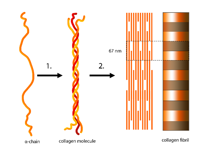 - Proline과 glycine이 매우 풍부: Glycine이 매 3번째 아미노산으로 나타나며, 작은 크기 덕분에 3개 사슬이 촘촘히 결합 가능
