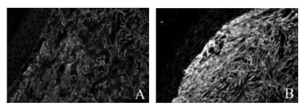 정상 피부 (a)와 scleroderma 피부 (b)에서 Fibronectin 침착. Scleroderma에서 fibronectin 침착이 증가한 것을 볼 수 있다.